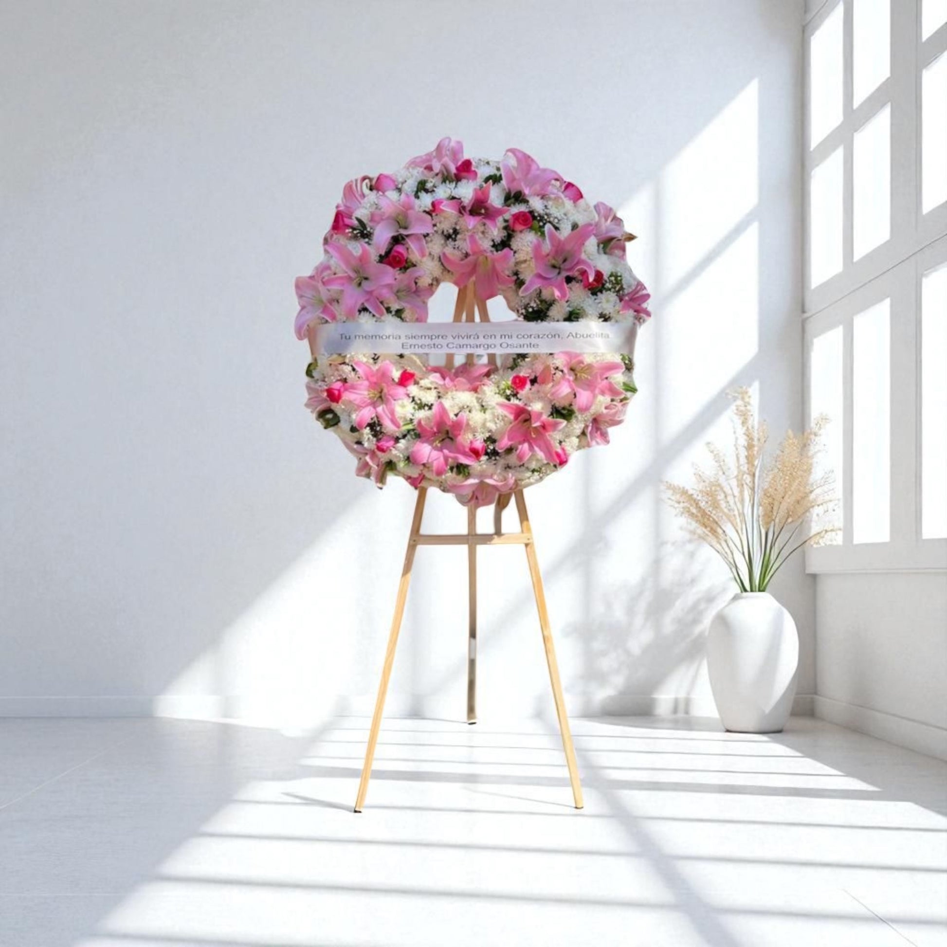 Nuestra Corona Fúnebre Condolencias Mujer está elaborada con rosas y flores en tonos suaves, que evocan ternura, pureza y cariño eterno. Su diseño delicado refleja la belleza y luz de quien deja una huella imborrable en la vida de sus seres queridos
