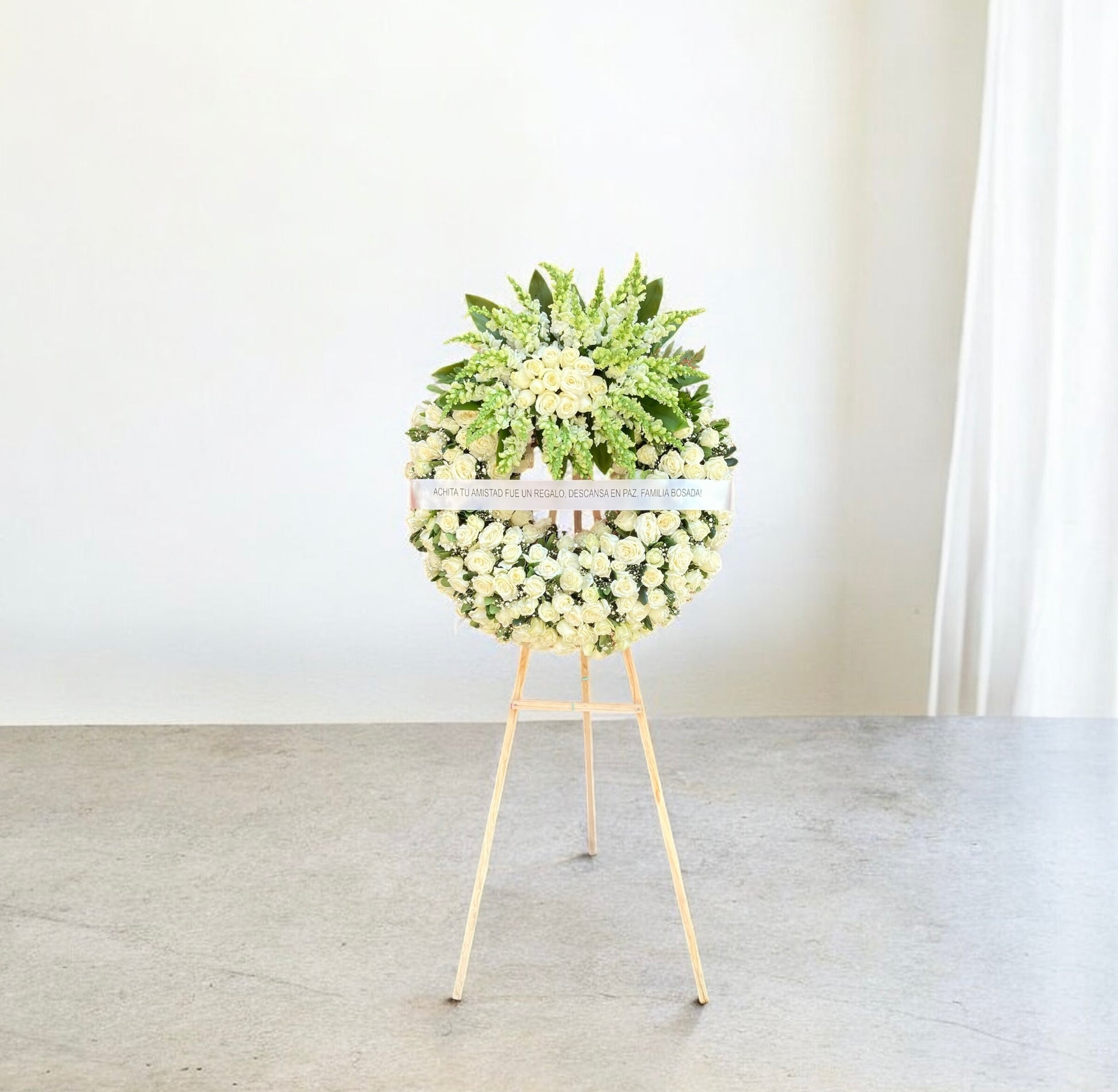 Nuestra Corona fúnebre de Rosas Premium con envío en CDMX Y EDOMEX está elaborada con rosas blancas frescas y follaje verde de temporada, creando un tributo floral lleno de pureza, serenidad y respeto. Su diseño armonioso transmite consuelo y gratitud, siendo una opción perfecta para honrar la memoria de un ser querido con distinción y cariño.