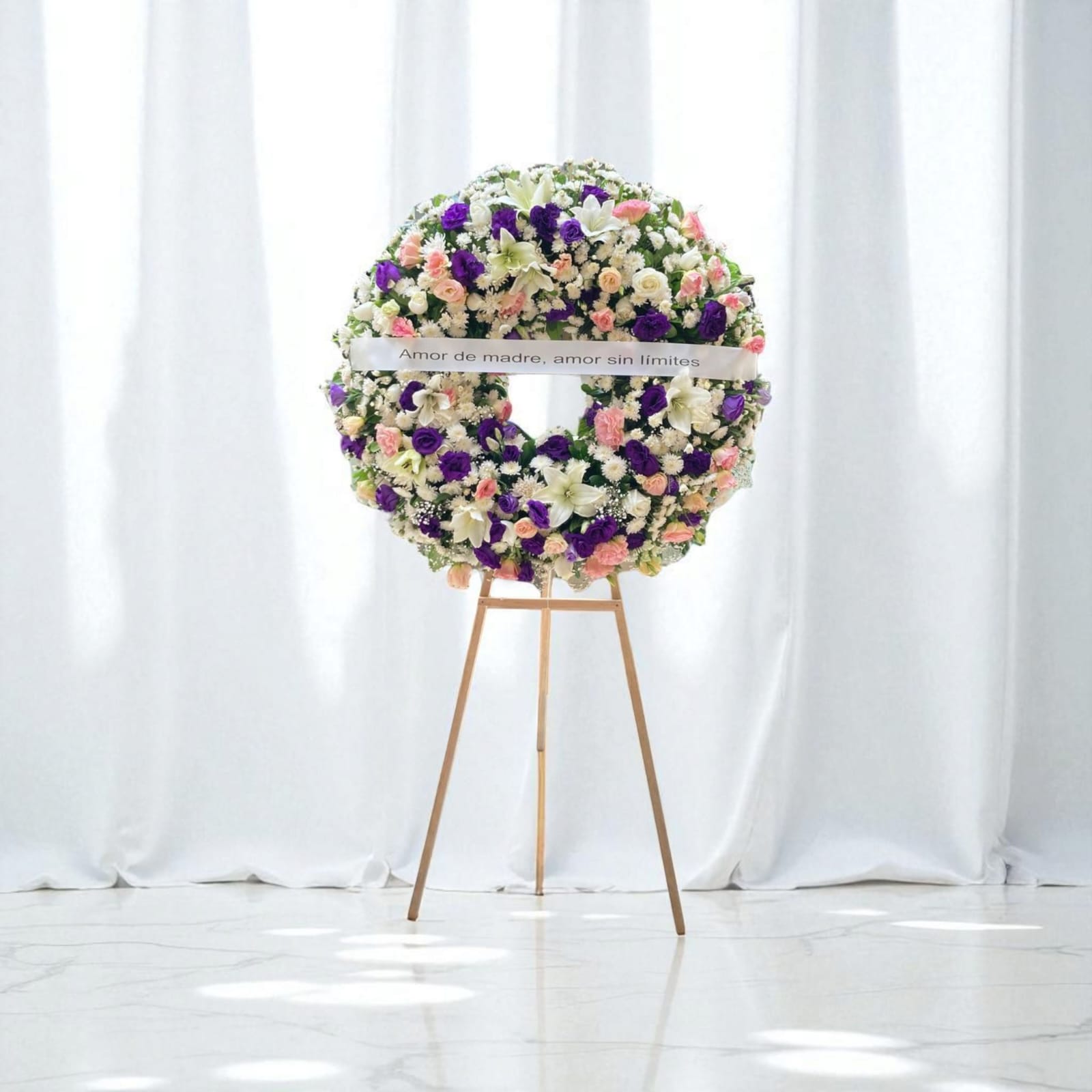Un homenaje lleno de ternura y respeto. Esta corona fúnebre está elaborada con delicados lisianthus en tonos rosa y morado, acompañados de flores blancas que simbolizan amor eterno, pureza y consuelo. Su diseño elegante y armonioso transmite un mensaje de despedida lleno de cariño y gratitud hacia ese ser querido que siempre vivirá en la memoria.