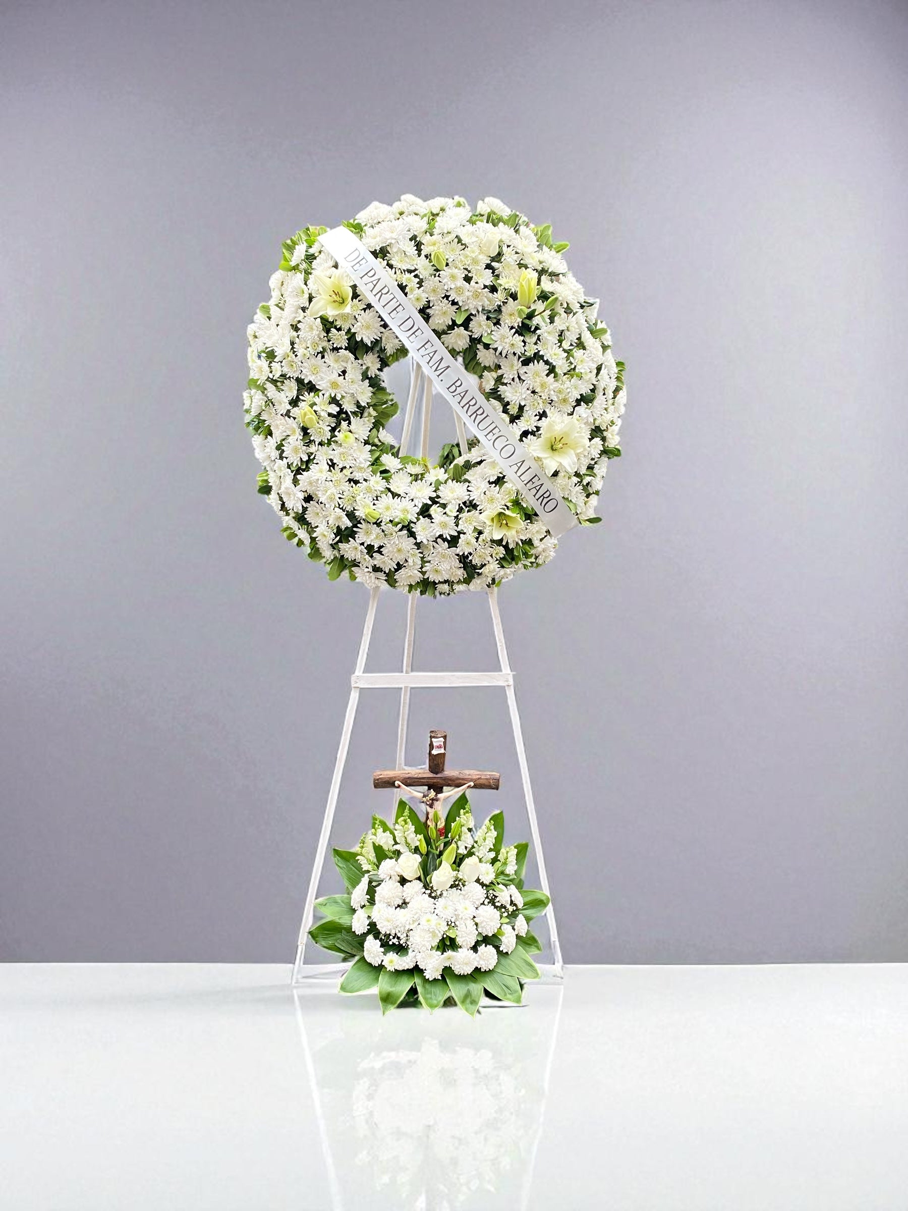Nuestra corona para funeral está elaborada con flores blancas frescas que representan pureza, paz y amor eterno. Incluye una cruz floral que transmite un mensaje de consuelo y esperanza, siendo el detalle perfecto para honrar la memoria de quienes siempre vivirán en el corazón.